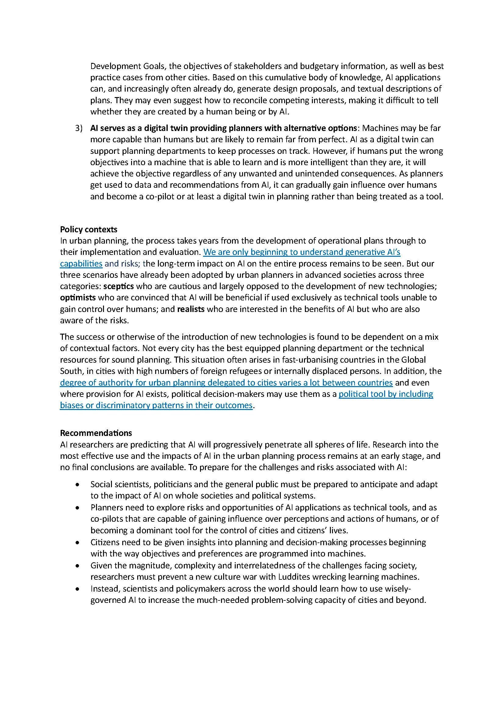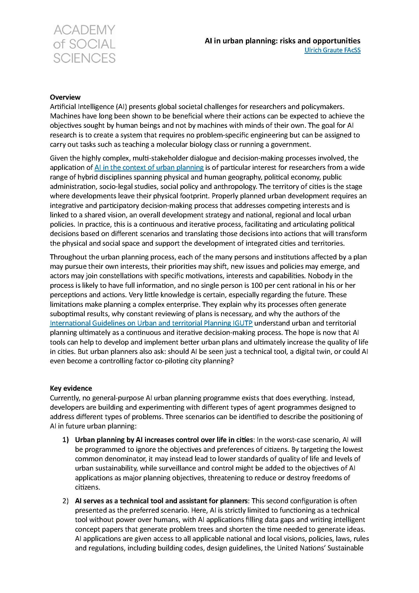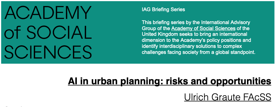 - I produced in spring 2024 in my function as international Fellow of the Academy of Social Sciences (UK) a Policy Briefing on AI in urban planning: risks and opportunities;