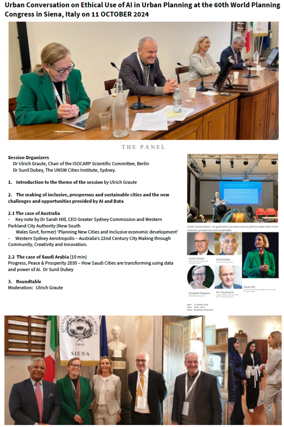 - After that I prepared together with Sunil Dubey (Sydney) an Urban Conversation at the 60th World Planing Congress of ISOCARP in Siena, Italy , 8-12 October 2024. As part of the Conversation I m on the same subject where I moderated a high level panel.