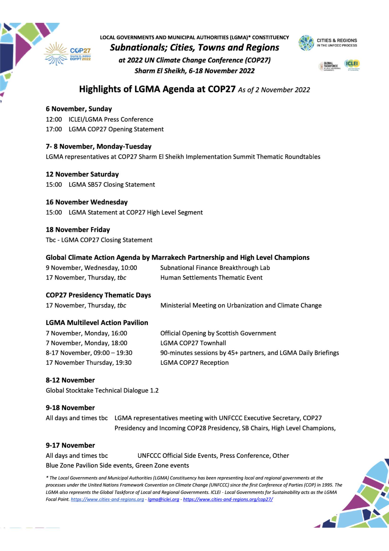 With continuous support from the Scottish Government and in collaboration with the COP27 Presidency, the Egyptian Ministry of Housing, the Marrakech Partnership and LGMA Partners, the Multilevel Action Pavilion will provide a home in the Blue Zone for local and regional governments throughout the two weeks of COP27 through 70+ sessions organized by 25+ partners.