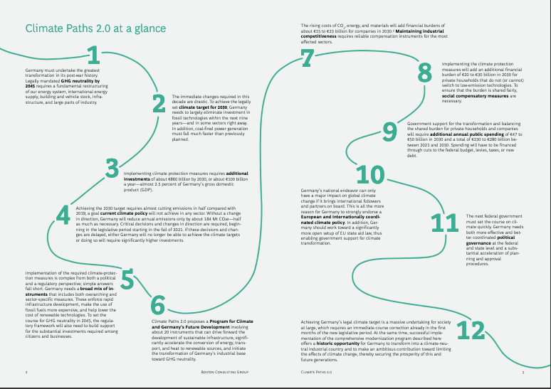 More than 150 experts of the Boston Consulting Group, the Federation of German Industries, and around 80 companies and associations contributed between March and September 2021 to the process leading on 21 October to the launch of the study 'Climate Paths 2.0 - A Program for Climate and Germany's Future Development'.[1]
