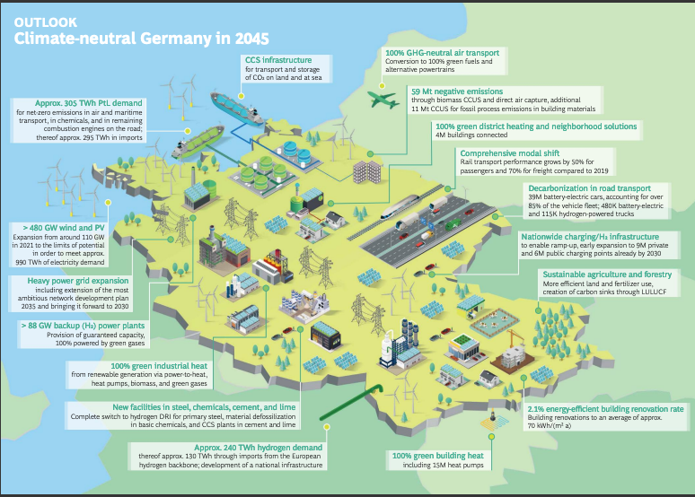 The first illustrations summarizes an outlook on major changes needed by 2045 to make Germany climate-neutral (sources page 6-7).