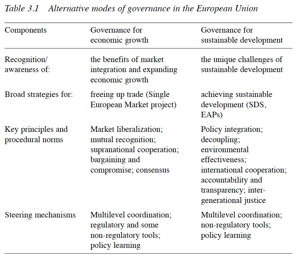 While a lot has developed since Bomberg's paper was published in 2004 it is still interesting for its analysis of alternative modes of governance in the European Union and how its components have to adapt from an originally economic growth focus of the EU to governance for sustainable development. That the EU left the original economic focus of the former European Economic Community EEC has contributed to the decision of the United Kingdom to leave the Union but that neither frees the EU not the UK from adapting the economy to sustainable development.