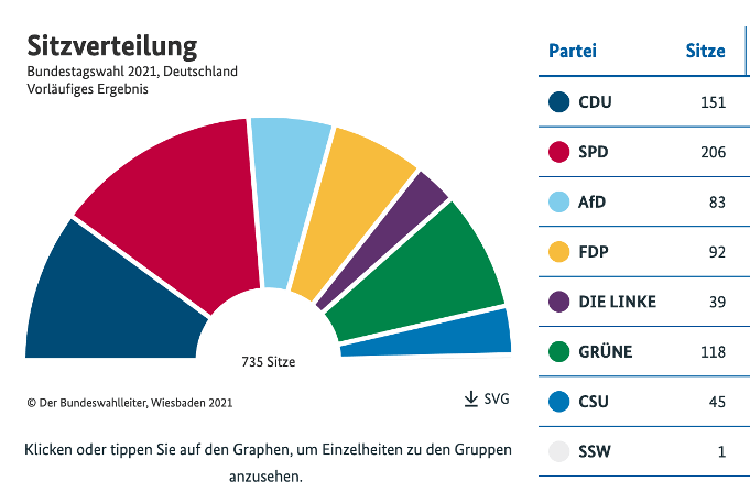 The table below shows possible governmental coalitions (‘Mögliche Koalitionen’). All combinations which add up to at least fifty percent of all seats could form a government. In total five coalition meet that threshold. However, the first two and the fifth group of the below list would be built on the basis of the old CDU and SPD coalition. Due to the insufficient performance of the coalition and the losses of the CDU these three options or not actively presumed – at least not for the moment. That leaves the Ampelkoalition (traffic light coalition: red, yellow and green) with 416 out of a total of 735 seats and the Jamaika-Koalition (black, yellow and green like the colors of Jamaica) with 406 seats as the more likely coalitions. Out of these two the Ampel is the most likely to succeed due to the difficult situation of the conservative CDU after 16 years in government and the heavy losses last Sunday. Well, that reduces complexity a bit.