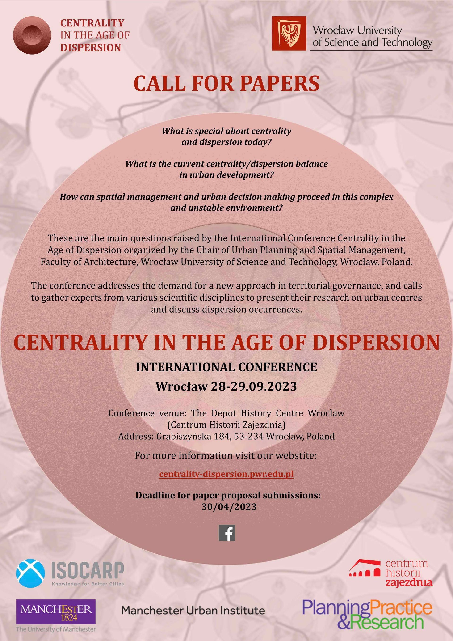 ISOCARP is suppporting the International Conference 'Centrality in the Age of Dispersion' at Wrocław University of Science and Technology 28-29.09.2023. As member of the Conference's Scientific Committee I am happy to inform that the call for papers is now open!