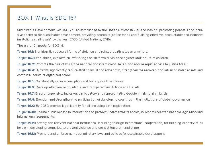 In this context, the 2030 Agenda for Sustainable Development, with its ambition to achieve more peaceful, just and inclusive societies (SDG 16), has become even more relevant. With less than a decade left to achieve the 2030 Agenda, there is a real urgency in working towards achieving the goals and targets – many of which have faced setbacks because of the COVID-19 pandemic, but which can be the basis upon which to “build forward better”. This is especially relevant in terms of SDG 16 and the need to embed the principles of SDG 16 in COVID-19 recovery processes, whether this means inclusive and quality delivery of services, reducing violence or ensuring better access to justice for all.