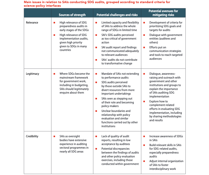 In addition to the global pact each member state has to prepare for implementing the SDG. One of the steps the UN Department of Economic and Social Affairs undertook in support of this is the production of the DESA Working Paper No. 157 ‘The role of external audits in enhancing transparency and accountability for the Sustainable Development Goals’. The paper written by Aránzazu Guillán Montero and David Le Blanc (ST/ESA/2019/DWP/157) examines the involvement of supreme audit institutions (SAIs) in auditing the preparedness of governments for SDG implementation.