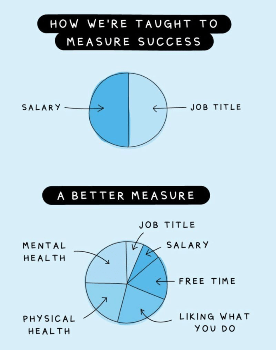 I learned measuring success along the model “Salary and Job Title”. And so, I was happy that my first employment was a well-paid director function right away. However, something was missing and soon I switched to the other model mentioned on the chart as “A Better Measure”. It was not an intentional choice between models. Instead, it developed gradually along with my experience but I am still happy with it.