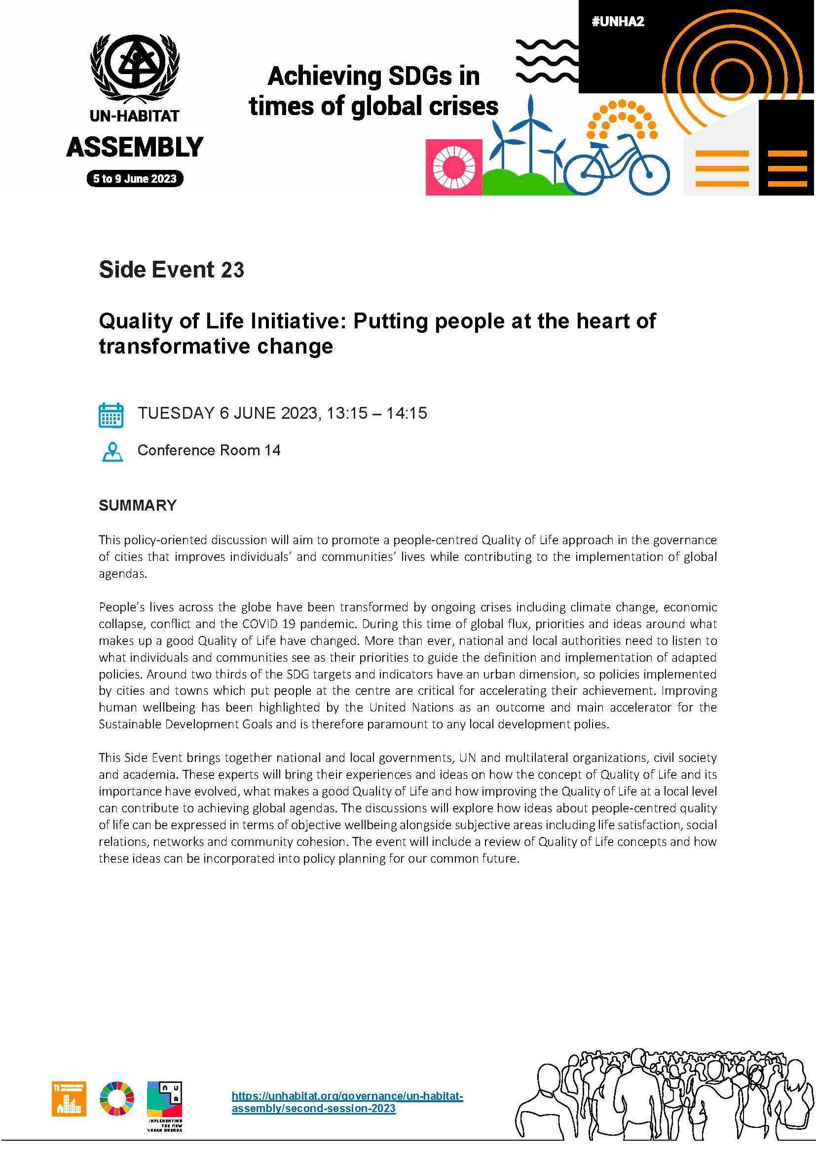 The new Initiative will go public at the UN-Habitat Assembly in June 2023 in Nairobi with a policy-oriented discussion at a special Side Event. It will aim to promote a people-centred Quality of Life approach in the governance of cities that improves individuals’ and communities’ lives while contributing to the implementation of global agendas. Speakers from the United Nations, Saudi Arabia, Spain, South Korea and Australia will contribute to the launch of this global dialogue.